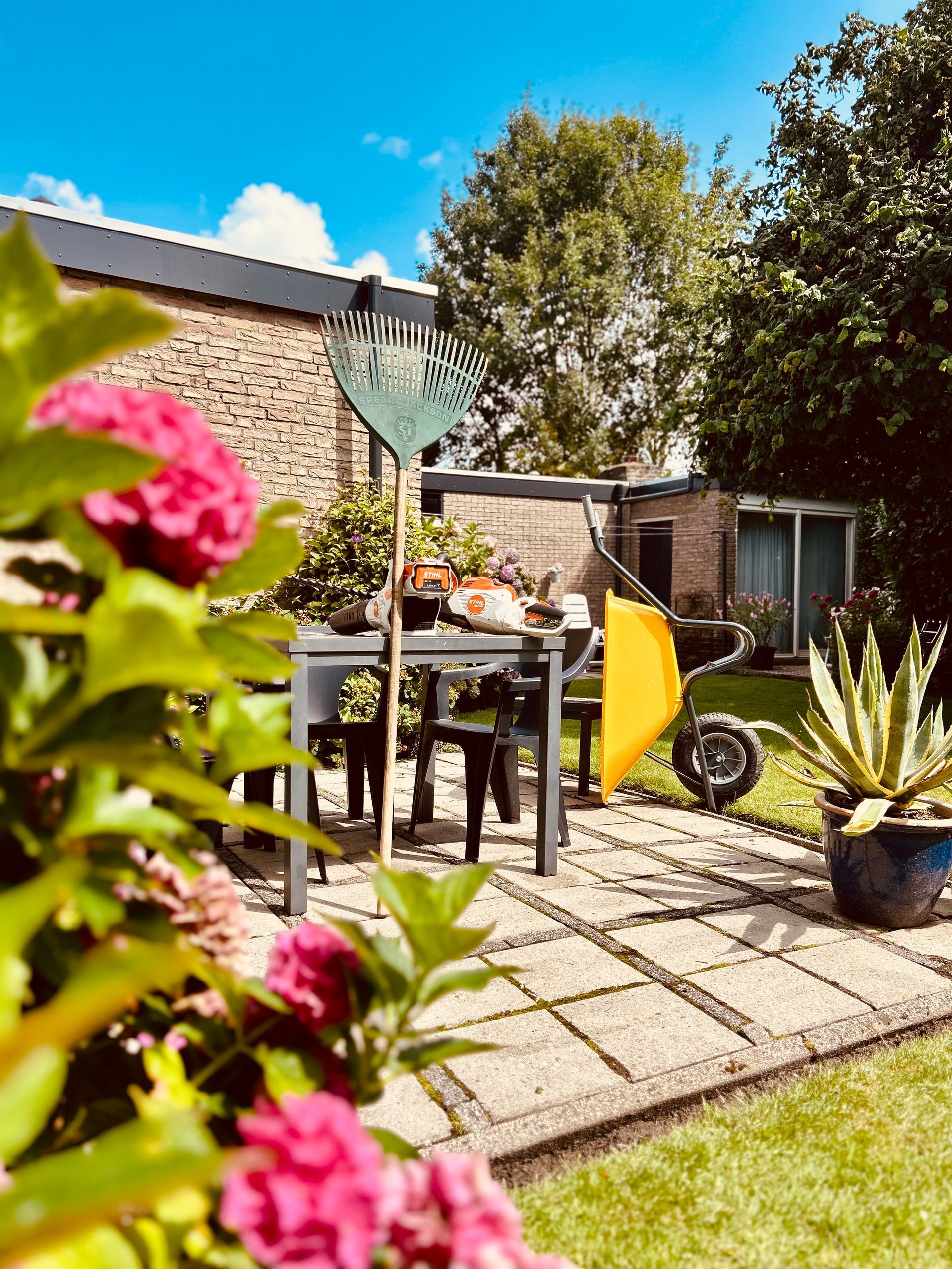 Ik maak gebruik van branden met een professionele gasbrander." Is dat nou niet gevaarlijk" hoor ik vaak van mensen en ik durf hardop NEE te zeggen. Door jarenlange ervaring en de kracht van herhaling is bestrating hiermee goed bij te houden. Daarnaast gebruik ik in in de poldergrond een handhak of scherpe hak om de borders schoon te houden.